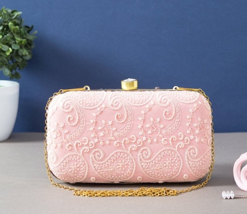 Embroidered Chikenkari Pink Clutch with Detachable chain strap