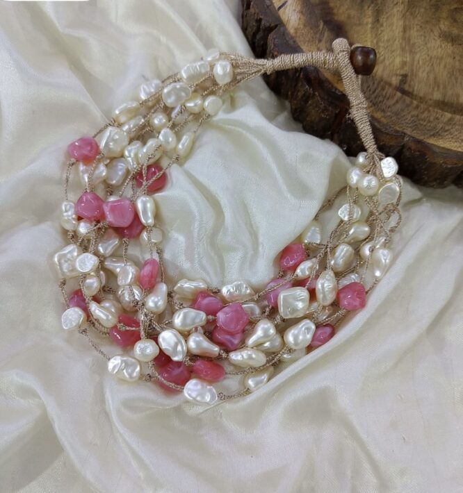 Fashionable and elegant jute – stone necklaces set is a wonderful idea to decorate your outfits. This designer jewelry design looks nice with any outfits, whether it’s a casual party or a formal evening event.